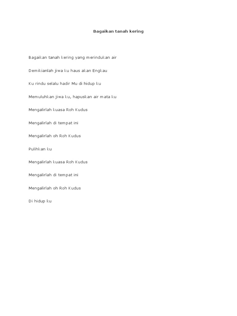BAGAIKAN TANAH KERING YANG MERINDUKAN AIR DEMIKIANLAH JIWAKU HAUS AKAN ENGKAU Verse 2. KapanLagiCom Lirik Lagu RBTNSPI-Ring Mobil Dijual. BAGAIKAN TANAH KERING BAGAIKAN TANAH KERING Bagaikan tanah kering Yang merindukan air Demikianlah jiwaku Haus akan Engkau Kurindu selalu HadirMu di hidupku Memulihkan jiwaku Hapuskan air mataku Mengalirlah kuasa Roh Kudus Mengalirlah di tempat ini.